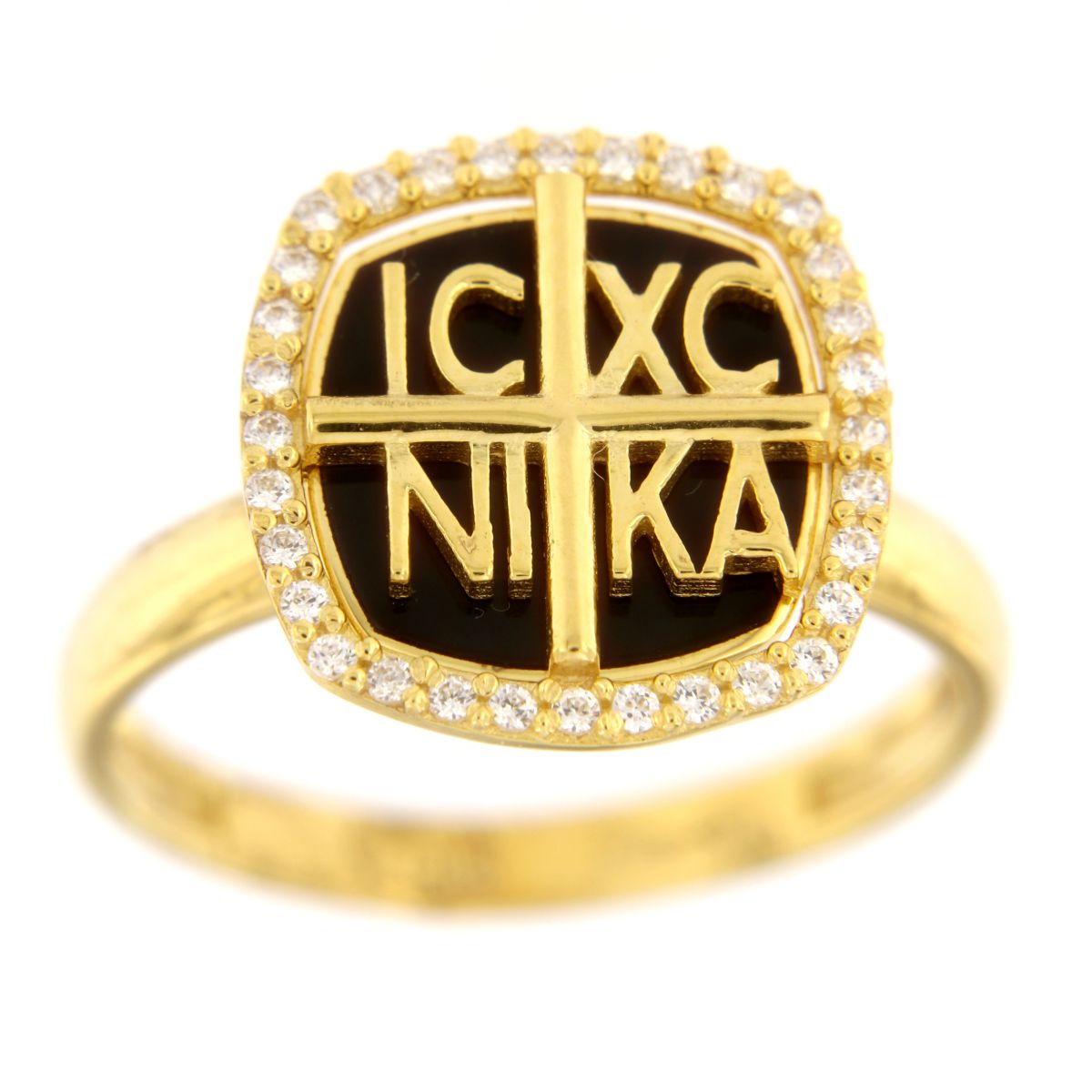 Γυναικείο δαχτυλίδι κωνσταντινάτο τετράγωνο με μαύρο σμάλτο σε κίτρινο χρυσό 14 καρατίων διακοσμημένο με λευκά ζιργκόν.