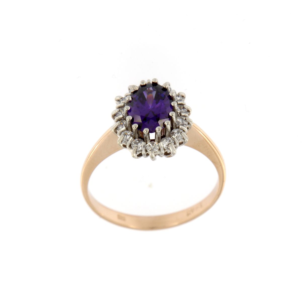 Γυναικείο δαχτυλίδι σε ροζ και λευκό χρυσό 14 καρατίων σε σχέδιο ροζέτας διακοσμημένο στο κέντρο με μοβ ζιργκόν περιστοιχισμένο με λευκά ζιργκόν.