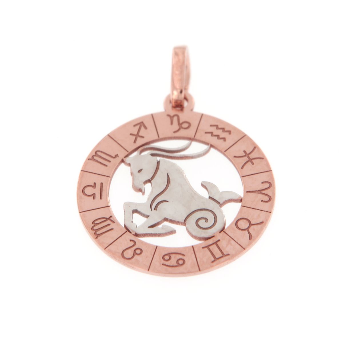 Ζώδιο Αιγόκερως μέσα σε ζωδιακό κύκλο σε λευκό και ροζ χρυσό 9 καρατίων .
