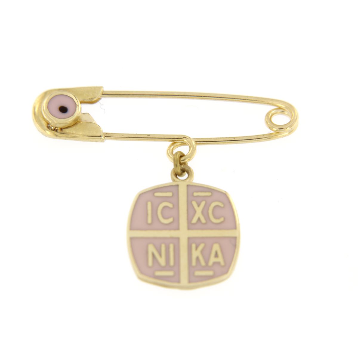 Παιδκή παραμάνα για κορίτστι, σε κίτρινο χρυσό 9 καρατίων, διακοσμημένη με κωνσταντινάτο με ροζ σμάλτο.