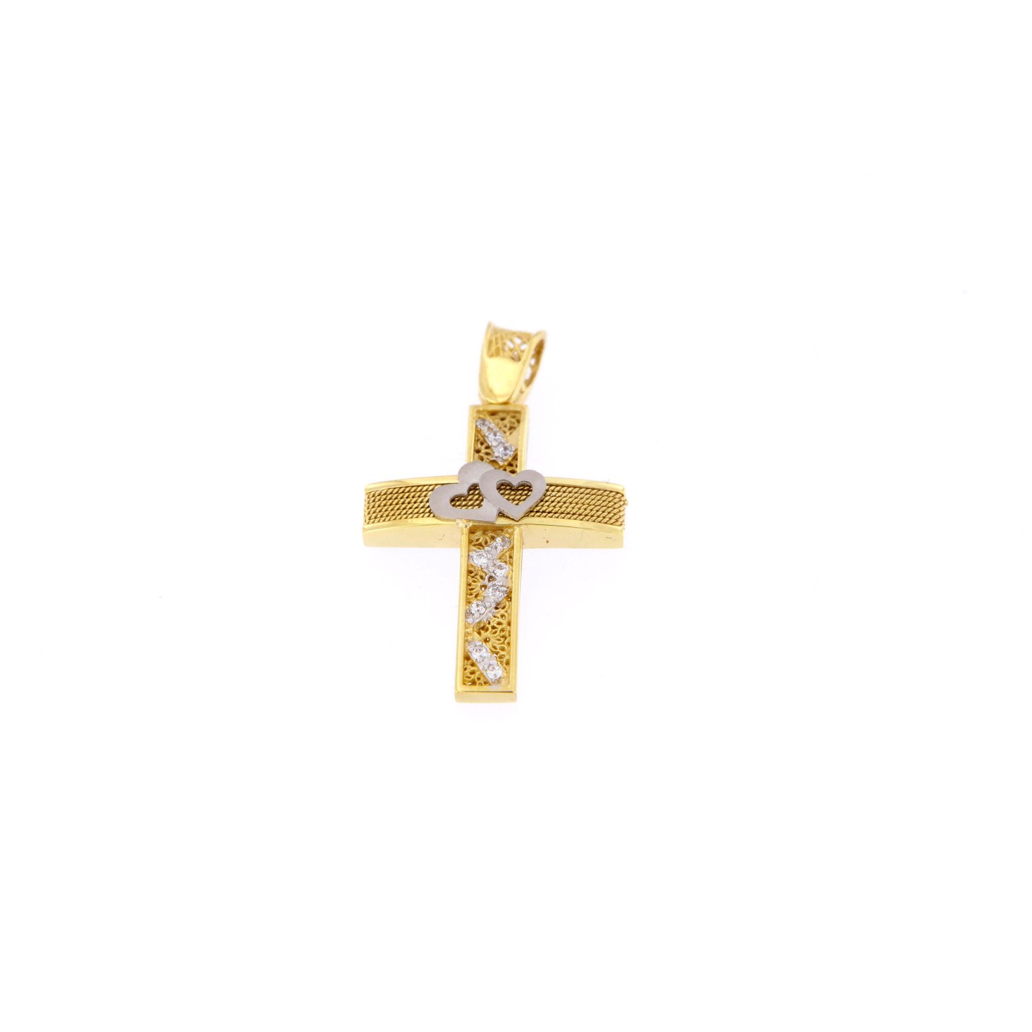 Γυναικείος χειροποίητος σταυρός σε κίτρινο και λευκό χρυσό 14 καρατίων με λευκά ζιργκόν.