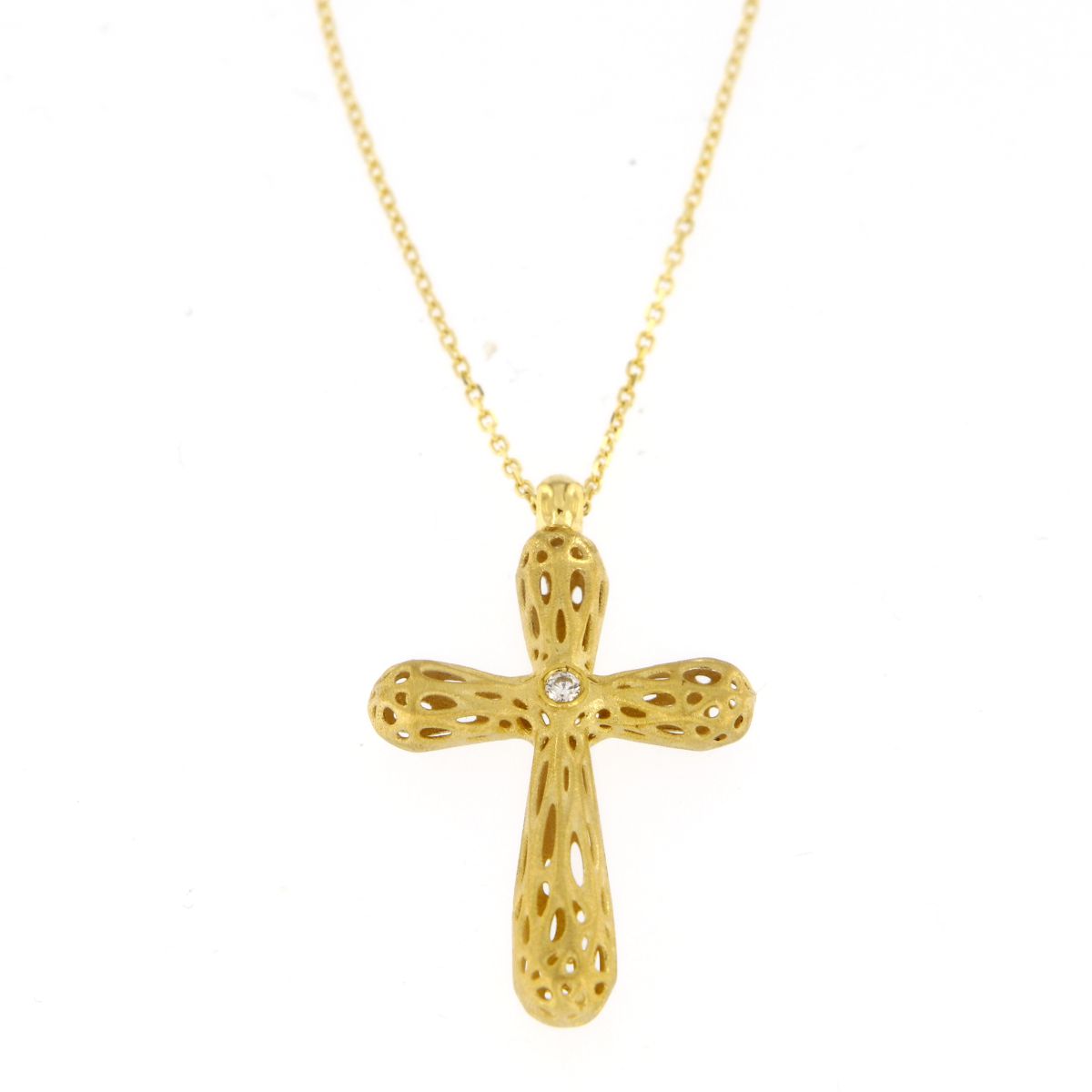 Γυναικείος σταυρός χειροποίητος σε κίτρινο χρυσό 14 καρατίων με λευκά ζιργκόν και αλυσίδα.
