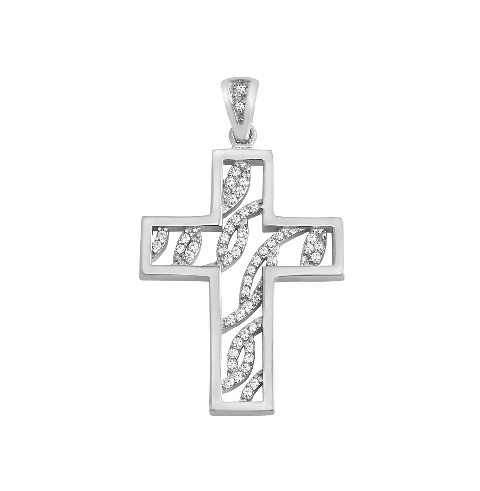 Γυναικείος σταυρός σε λευκό χρυσό 9 καρατίων με λευκά ζιργκόν.