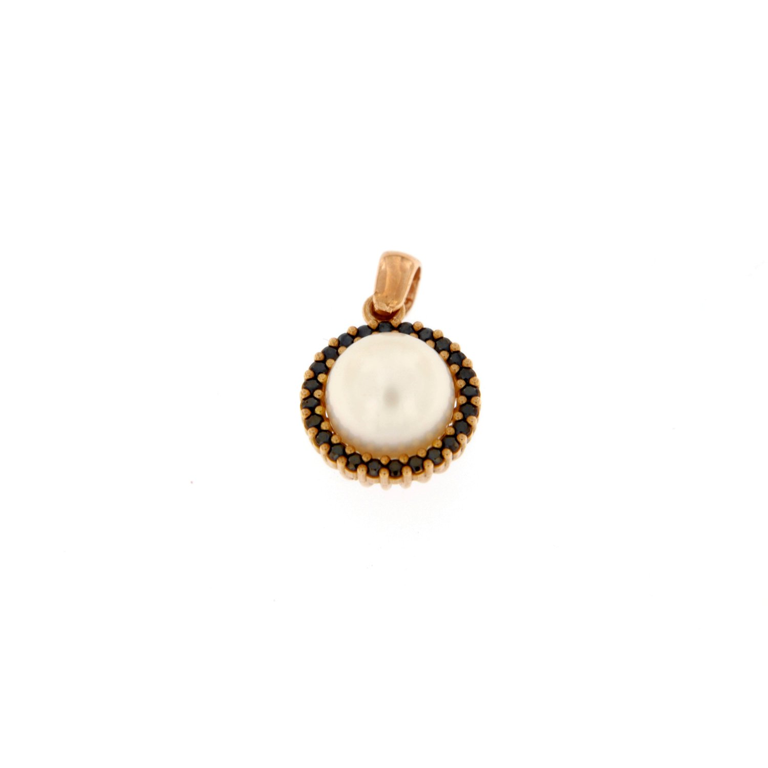 Γυναικείο μενταγιόν σε ροζ χρυσό 14 καρατίων ροζέτα με μαργαριτάρι και μαύρα ζιργκόν.