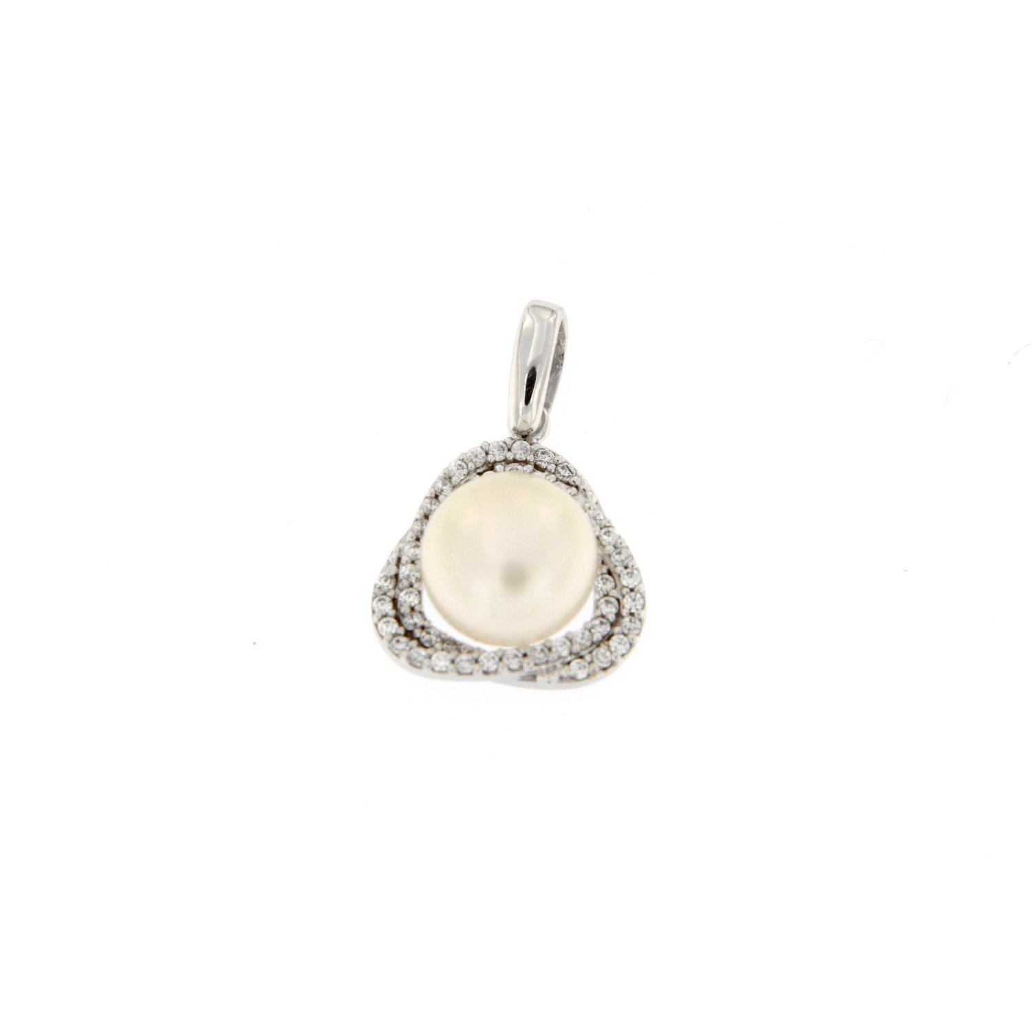 Γυναικείο μενταγιόν σε λευκό χρυσό 14 καρατίων ροζέτα με μαργαριτάρι και λευκά ζιργκόν.