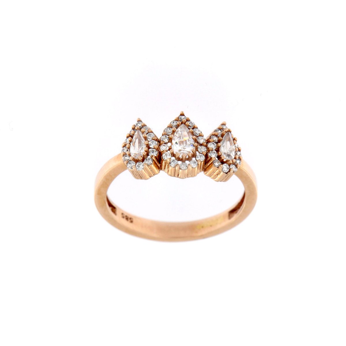 Women’s ring in rose gold 14 carats in rosette design and teardrop shape decorated with white zircons .