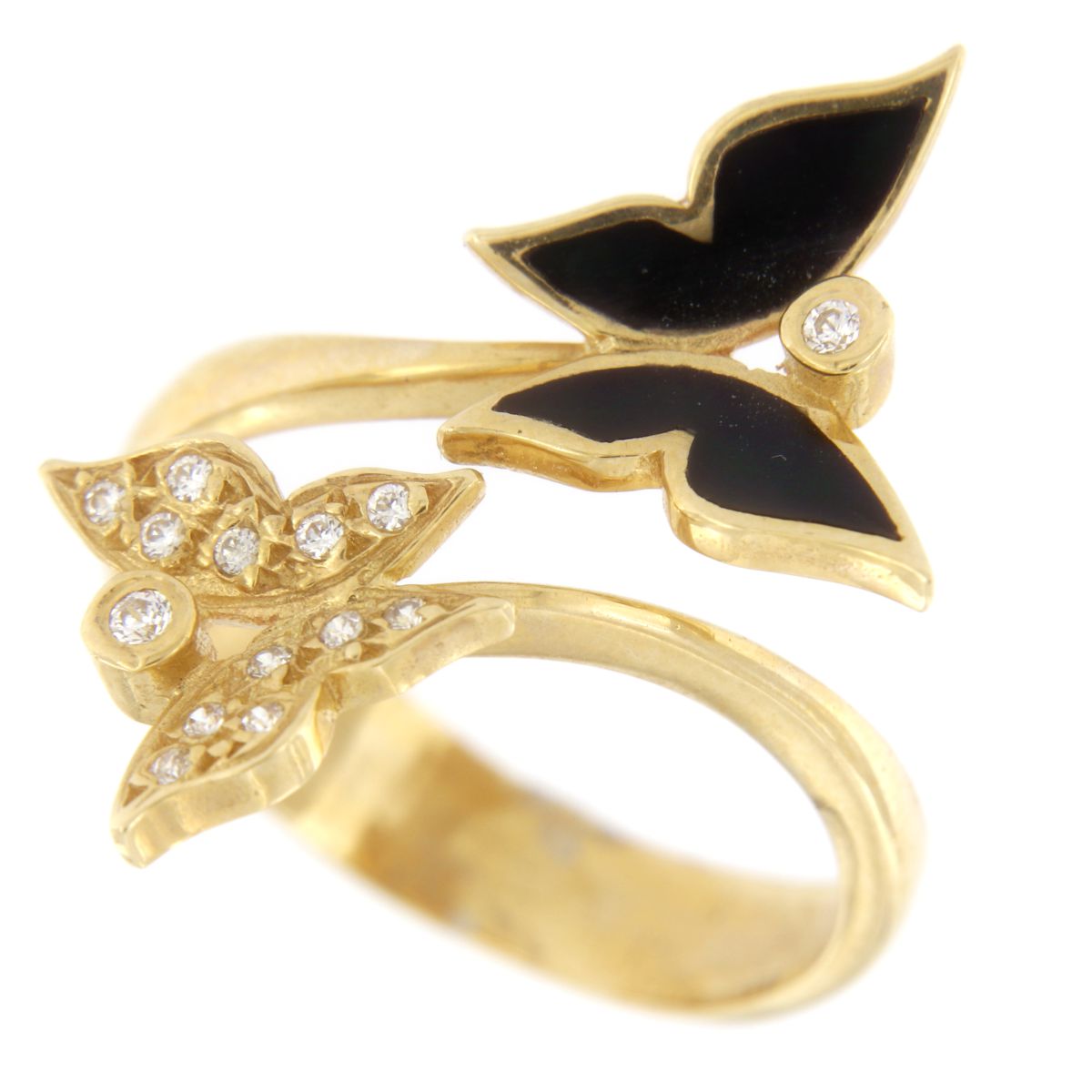 Γυναικείο δαχτυλίδι με δύο πεταλούδες να το διακοσμούν σε κίτρινο χρυσό 14 καρατίων με σμάλτο και ζιργκόν