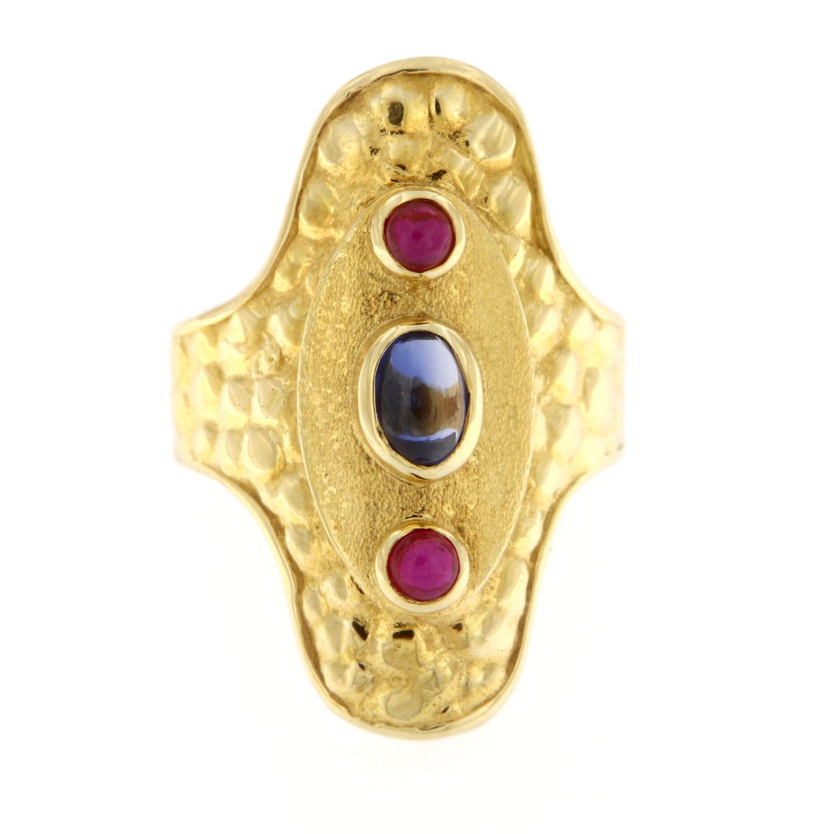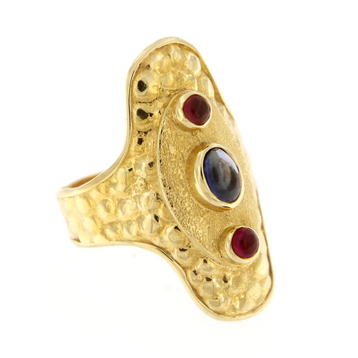 Γυναικείο δαχτυλίδι σε κίτρινο χρυσό 14 καρατίων διακοσμημένο με Συνθετικό Ζαφείρι και Συνθετικό Ρουμπίνι.