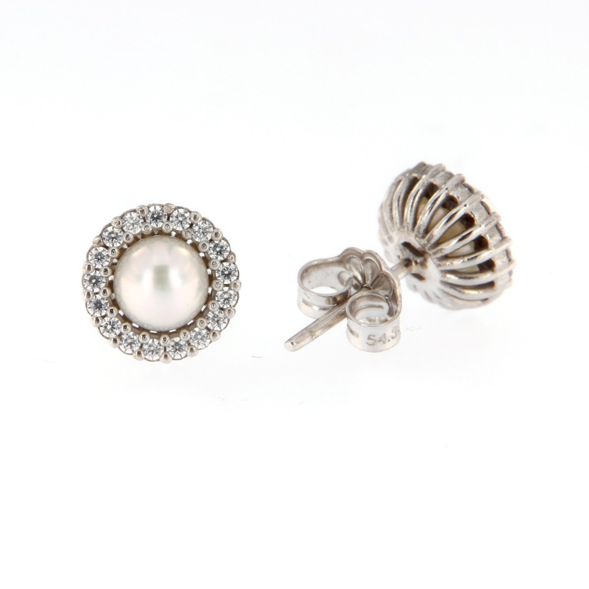 Women’s stud earrings in 14ct white gold in rosette design decorated in the center with pearl surrounded by white zircons.