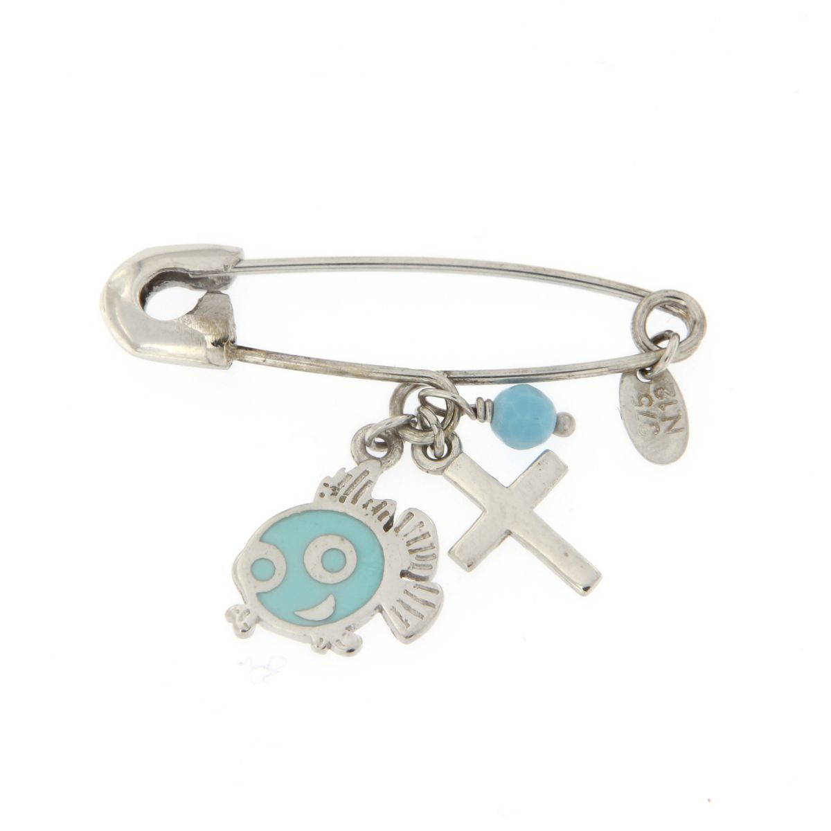 Child safety pin for boy, in 9 carat white gold, decorated with a cross, fish motif with enamel and turquoise.