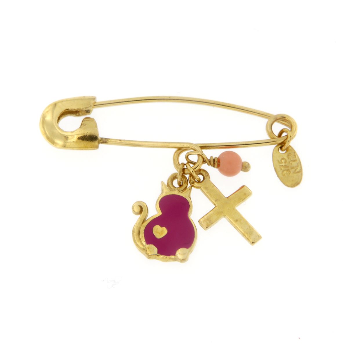 Child safety pin for girl, in 9 carat yellow gold, decorated with a cross, kitten motif with enamel.