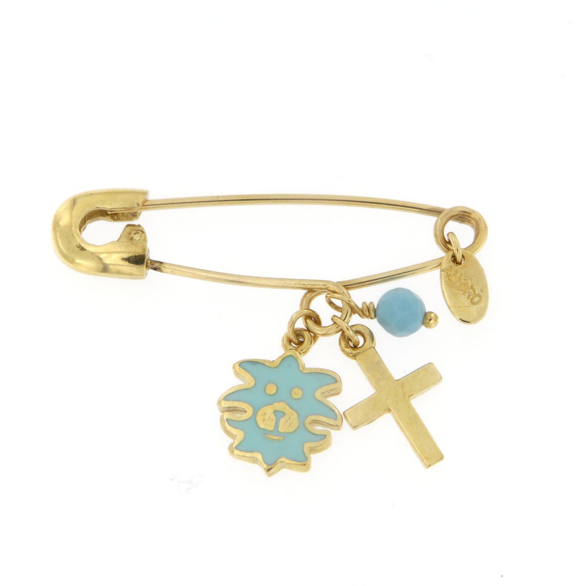 Child safety pin for boy, in 9 carat yellow gold, decorated with a cross, lion motif with enamel and turquoise.