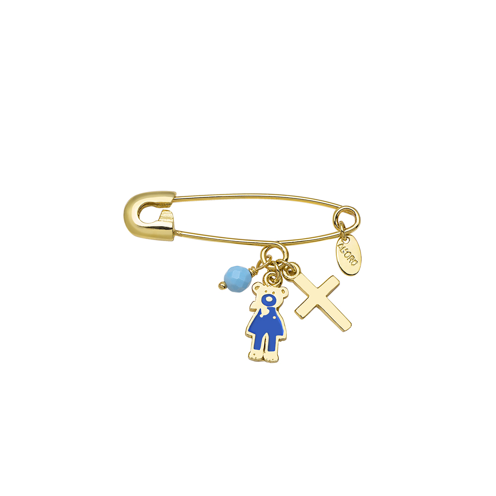 Children’s safety pin for boy, in yellow gold 9 carats decorated with cross, teddy bear fashion with enamel and turquoise.