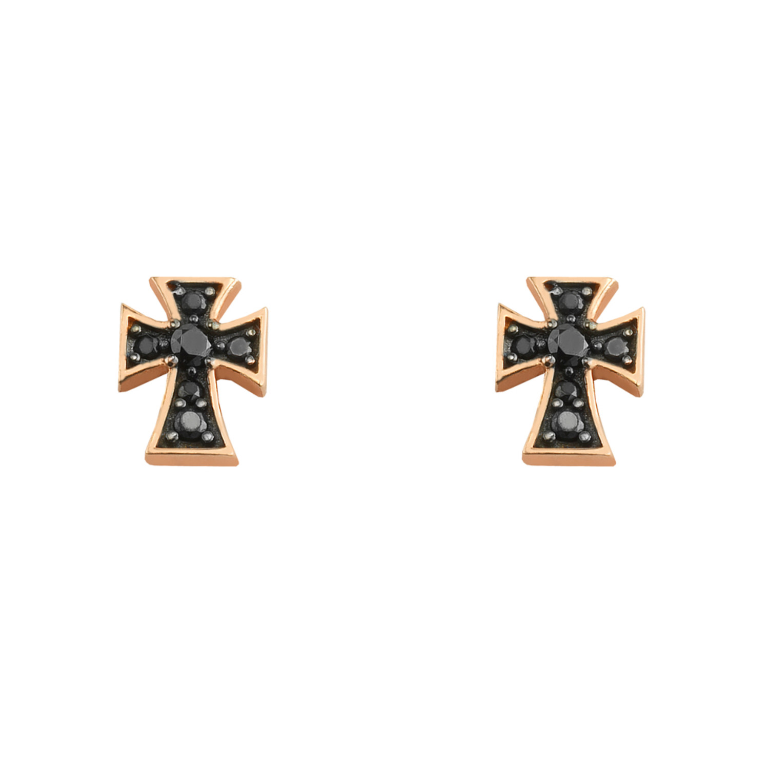 Women’s pinned earrings in 9-carat pink gold with cross with black zircon.