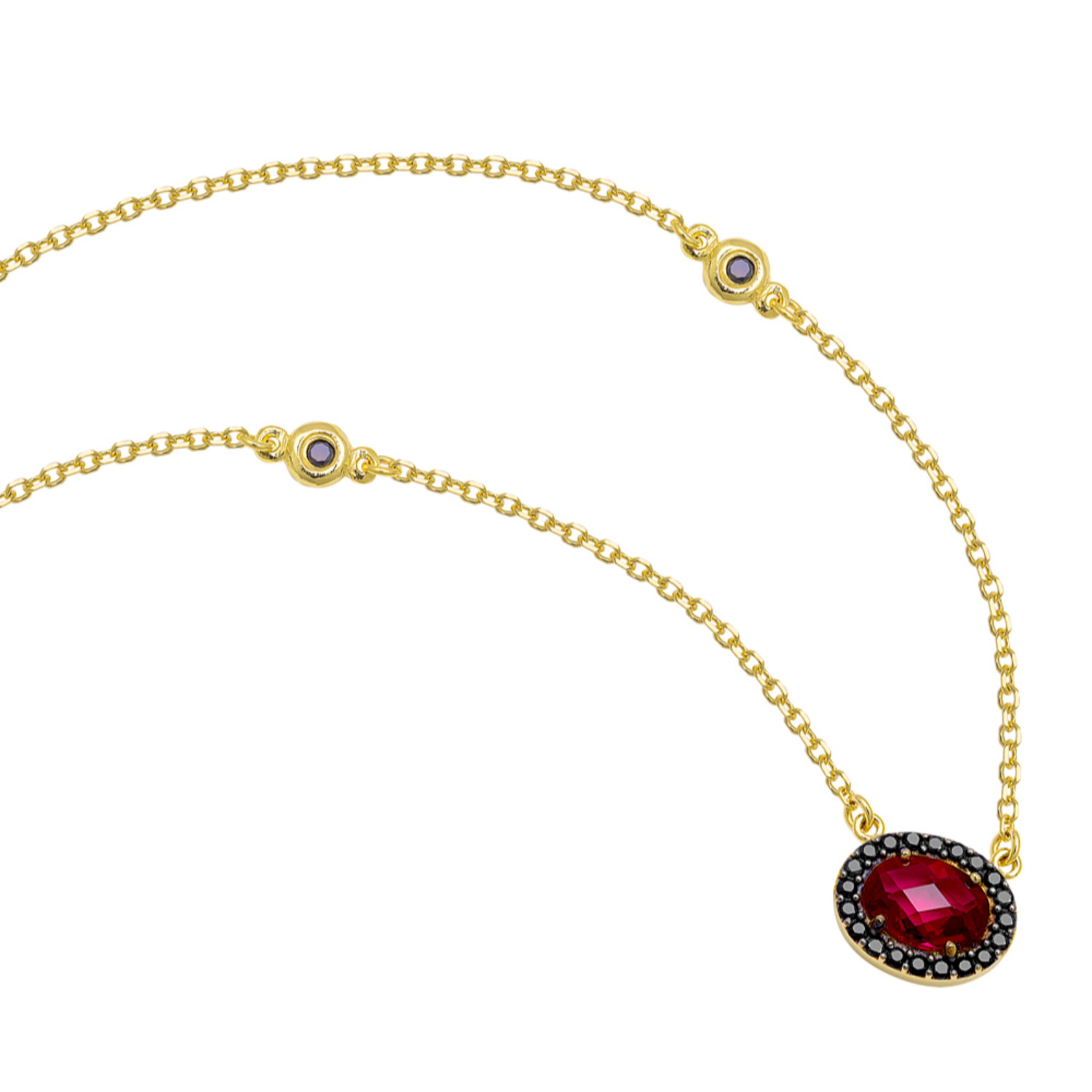 Women’s necklace in 14 carat yellow gold with synthetic ruby and black zircons.