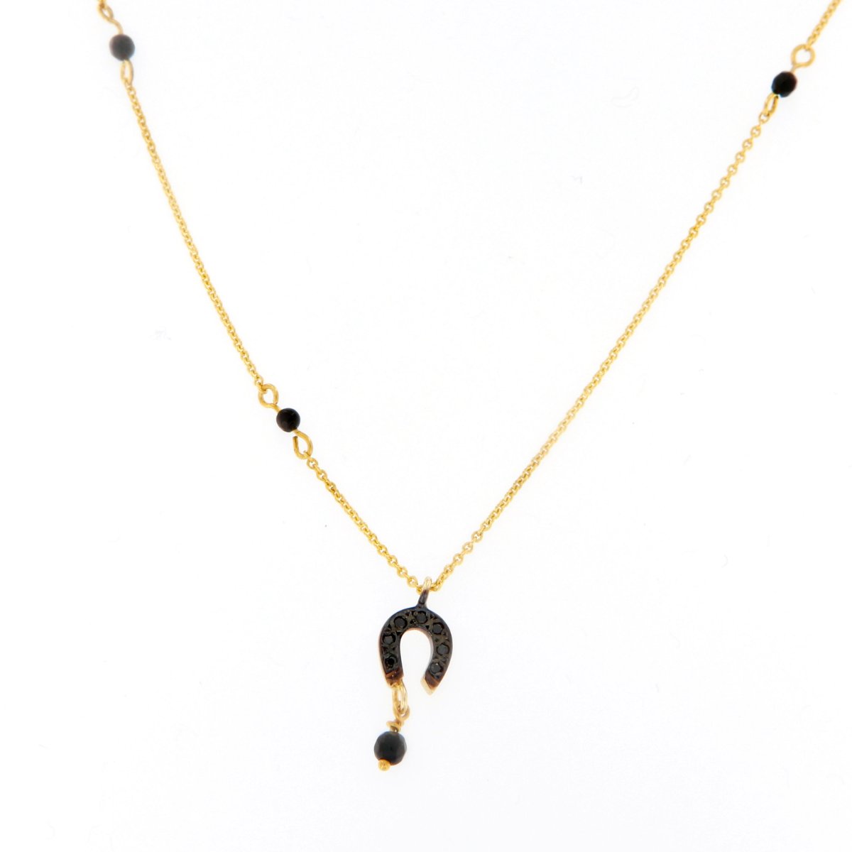 Women’s necklace in 14ct yellow gold with hanging horseshoe with onyx and black zircons.